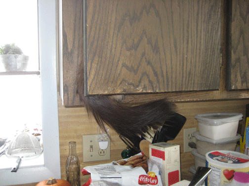 Just for your enjoyment…. Monkey (Terry’s cat) got so upset with all the water she jumped into the cabinet and the door shut on her. There is nothing in this cabinet but cans so ‘no fur in food’ occurred.