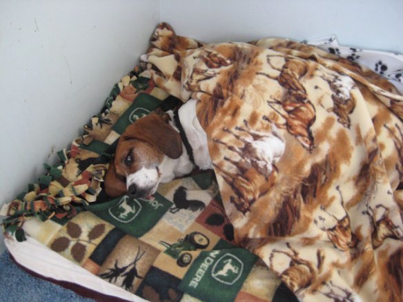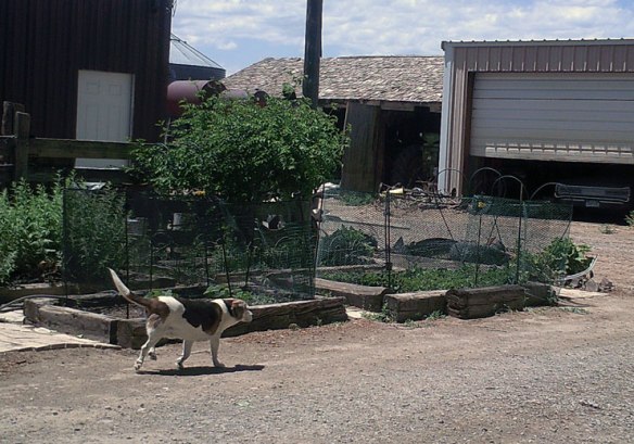 “Boomie, you can’t go off on a walk-about anymore.  Your back leg doesn’t work, your knee hasn’t really healed from whatever you did to it this winter, you can’t see well, and your hearing is off.  I’m sorry Beaglie, your exploring days are over.  You have to stay in the yard and close to mom now.”