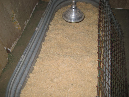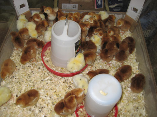 A thermometer is placed in the brooder, under the lamp, to check for heat-95degrees the first week, and then reduced by 5 degrees per week after that.