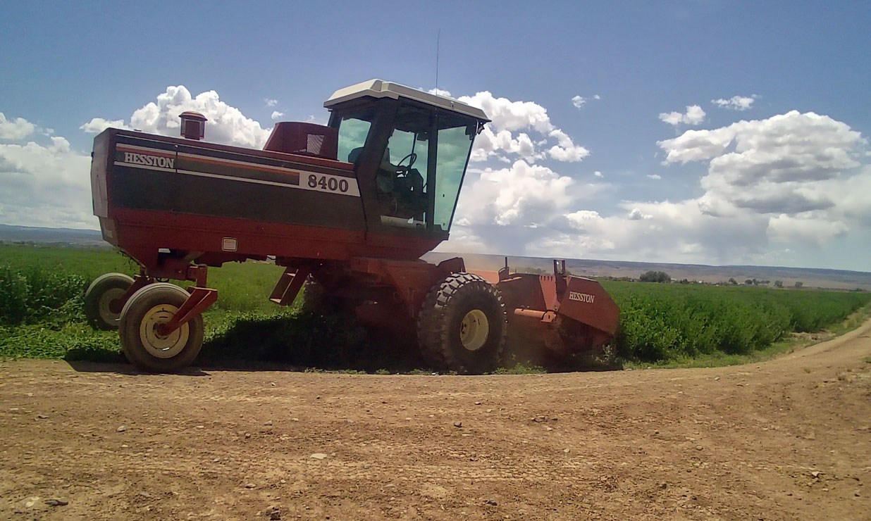Now if the weather will just hold off for the week and we have a drying breeze —not a row tossing wind–we will get this alfalfa into hay form, then into small bale form, we will get it onto the back of trucks or trailers, and haul a huge bunch down to Delta Elevator for them to sell for winter feed.