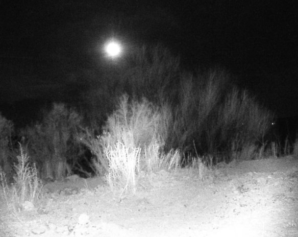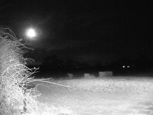 I love the long shadows the clean and silver moon-light throws behind the bushes, the trees, and the equipment