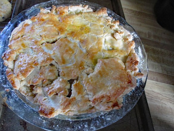 It took me two days to create—first off because of food allergy issues I had to make my (mock Venison pie) with a gluten-free crust. Then (instead of venison, being fresh out of venison, I cooked up a nice sized pork roast.