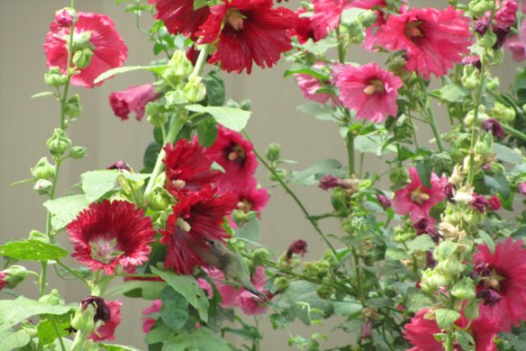 I hope you can see the tiny little green body getting a bite to eat in the middle of the hollyhock…