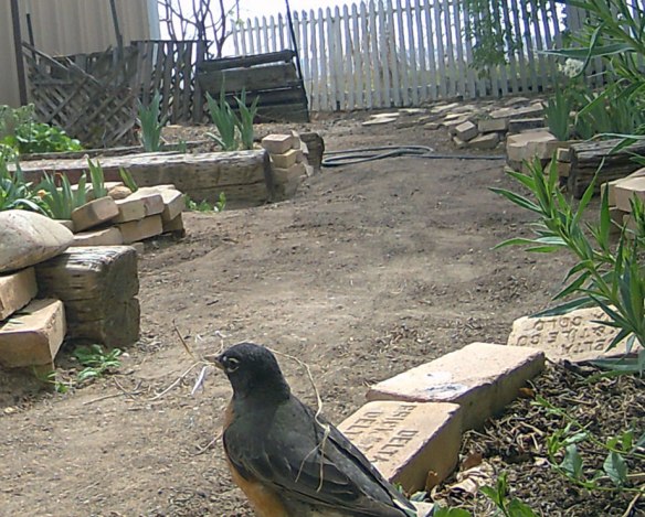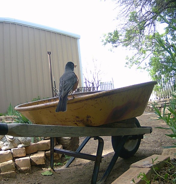 He is very happy when I’m watering as he can then find big fat worms, but even if I’m weeding he hops along beside or behind, or maybe just over in the other bed seeing what it is he can find…food, nesting material, who knows…something.